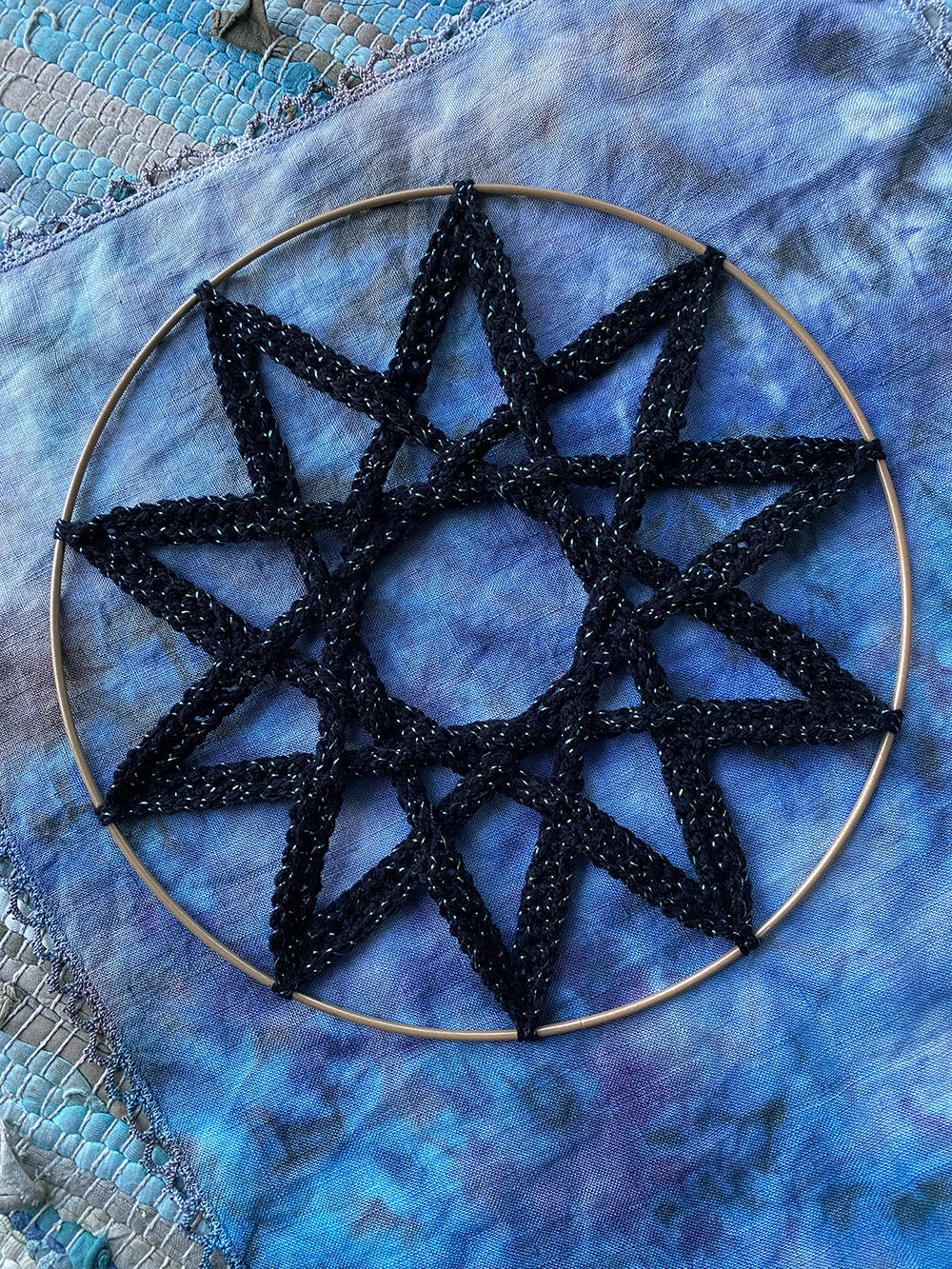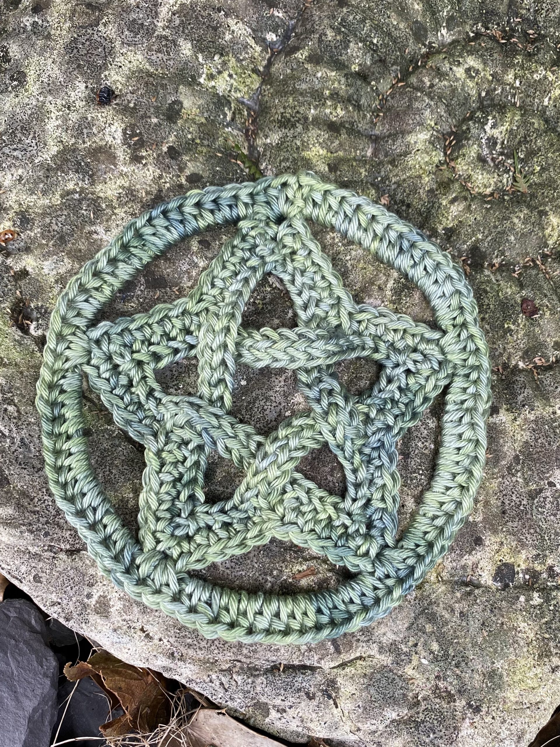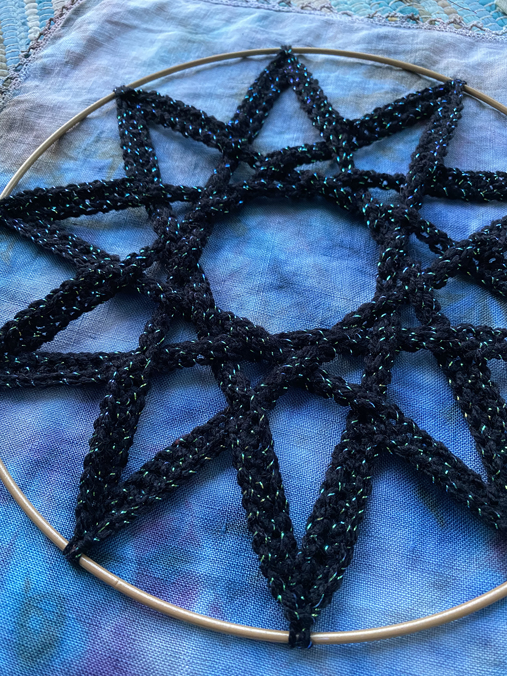 The pattern is made-to measure – I hope you can take what is here and make your weavy pentagram to fit any size star frame or hoop. You can use any yarn weight, hook size and frame sizes that you have.