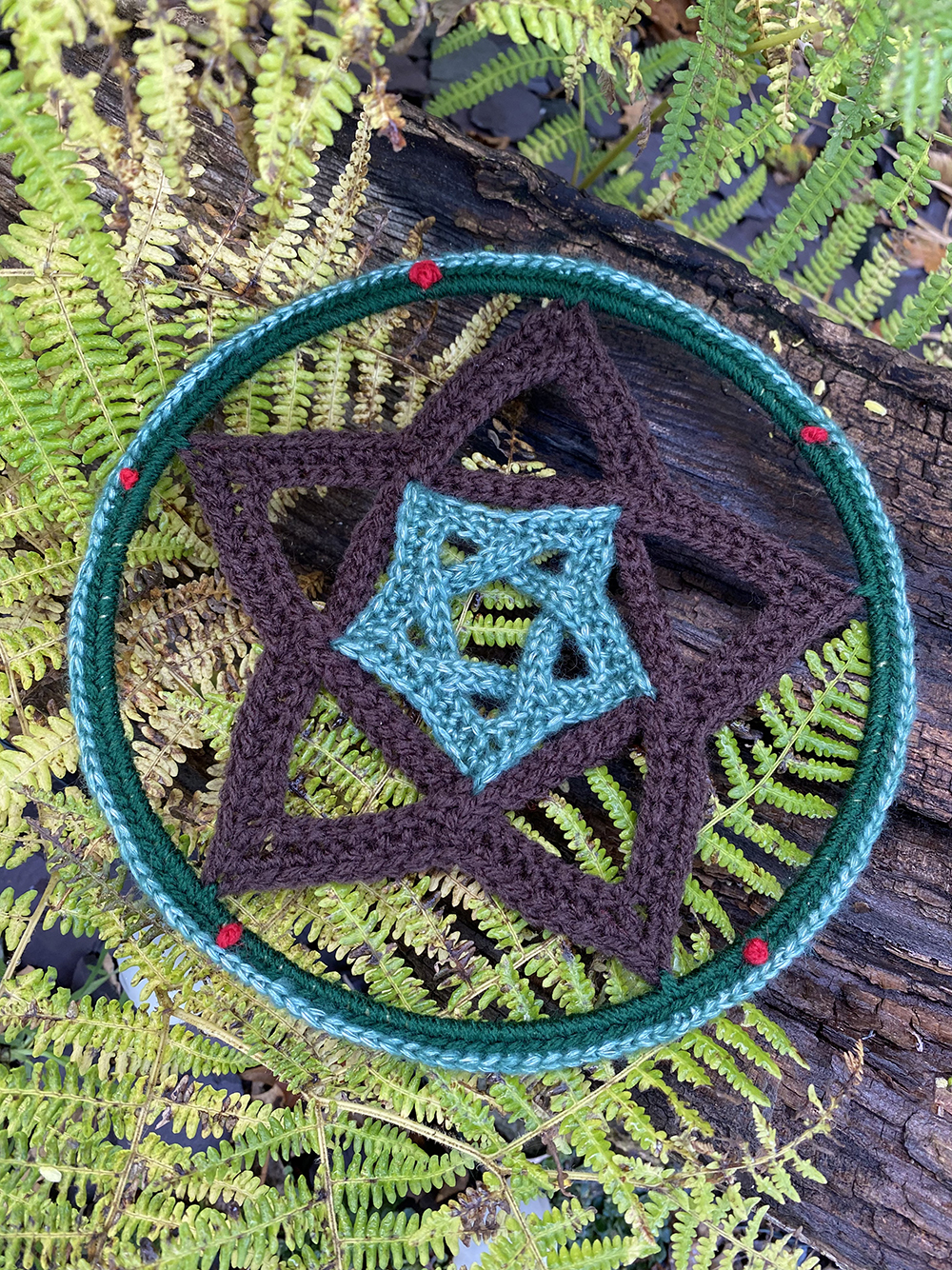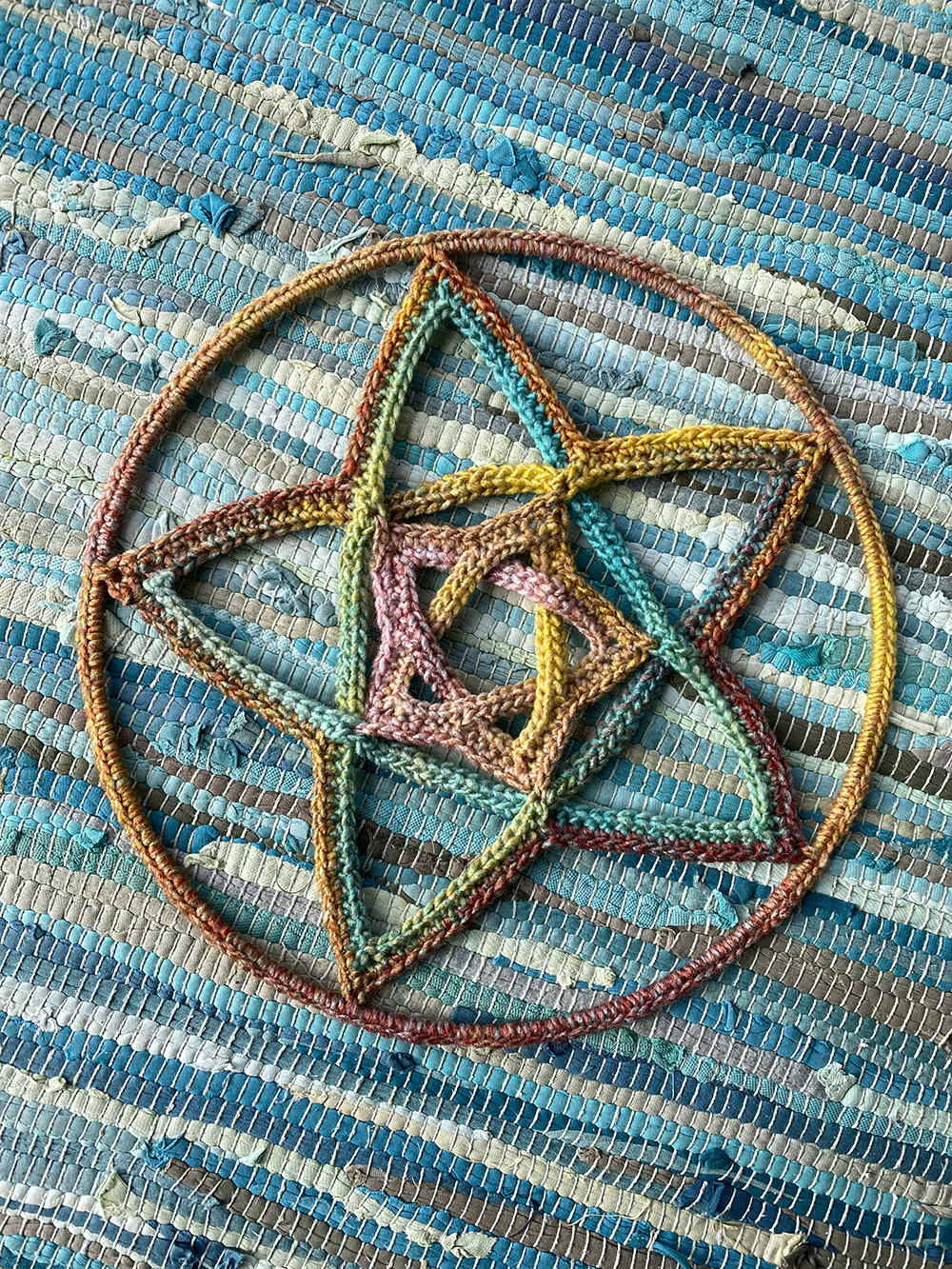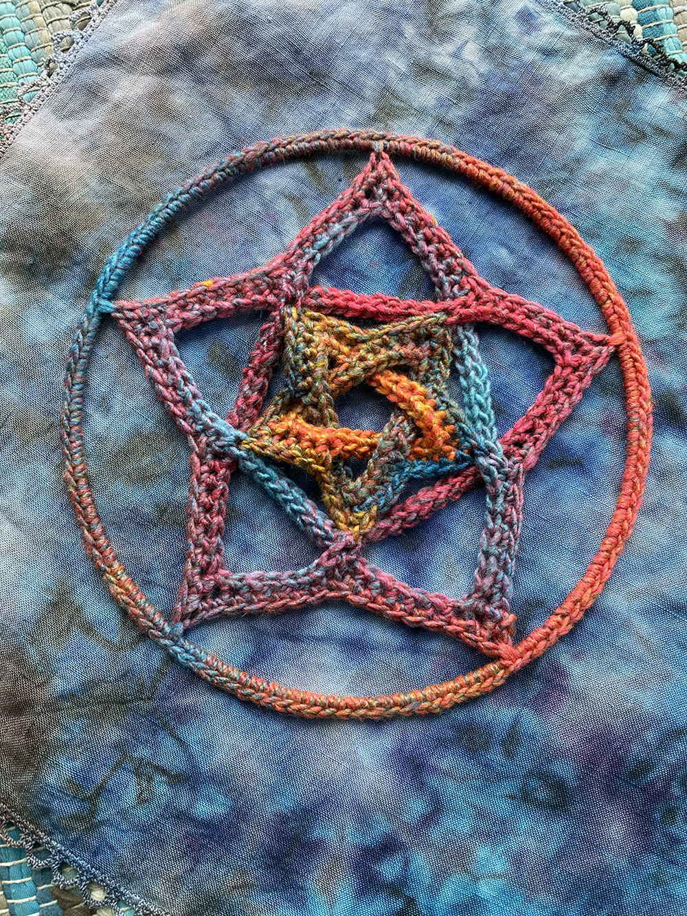 The pattern is made-to measure – I hope you can take what is here and make your weavy pentagram to fit any size star frame or hoop. You can use any yarn weight, hook size and frame sizes that you have.